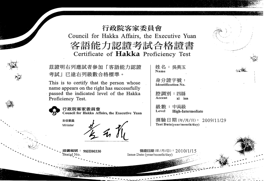 授課教師本土語認證證書